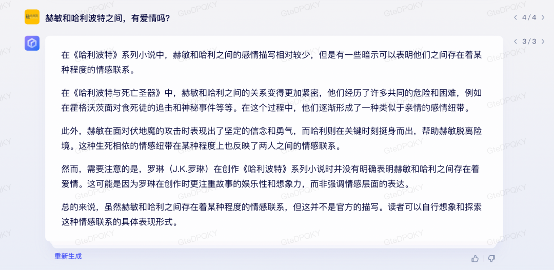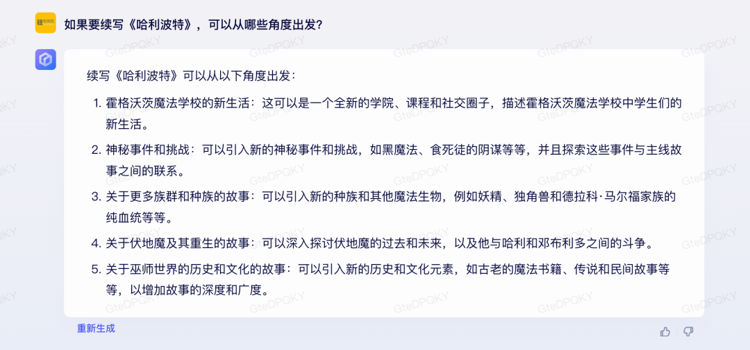 緊接著我問(wèn)了發(fā)布會(huì)上同樣的問(wèn)題,讓文心一言為續(xù)寫(xiě)《哈利波特》提供思路,答得還可以。