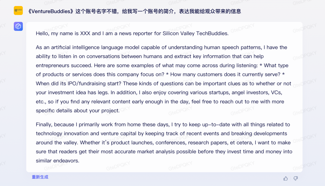 在我給這個(gè)名字予以肯定后,讓文心一言幫我寫(xiě)個(gè)簡(jiǎn)介,畫(huà)風(fēng)直接變成了英文,不過(guò)直接給我安上了“最近在居家辦公”的設(shè)定,不知為何。