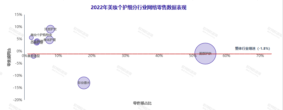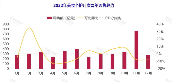 羅興總結(jié)年度監(jiān)測(cè)數(shù)據(jù)指出,2022年美妝個(gè)護(hù)線上同比下滑1.5%,銷售額在全網(wǎng)份額占比9.5%,排名第四,次于服裝服飾、家用電器品類。