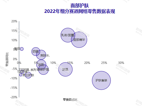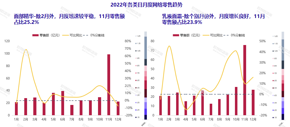 白皮書顯示,在面部護(hù)理產(chǎn)品中,增速最快的兩大細(xì)分類目為面部精華和乳液面霜。二者月度增速都較為平穩(wěn),11月銷售額最為亮眼,零售額占比均在24%左右。