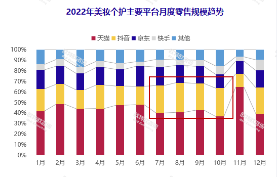 從渠道來看,天貓仍為美妝主戰(zhàn)場(chǎng),2022年1-7月零售額占比接近50%。抖音則成為2022年最大的增量場(chǎng),占比達(dá)21.5%,同比提升5個(gè)百分點(diǎn)?!皬?月開始,抖音占比出現(xiàn)了大幅增長(zhǎng)。”