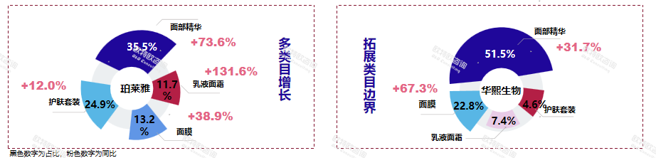 除此之外,作為本土企業(yè)中的兩大佼佼者,珀萊雅和華熙生物也在不斷拓展類目上的邊界。白皮書顯示,珀萊雅的乳液面霜類產(chǎn)品占比雖然只有11.7%,但增勢(shì)猛烈,同比增長(zhǎng)131.6%。華熙生物的面膜品類也表現(xiàn)良好,同比增長(zhǎng)67.3%。