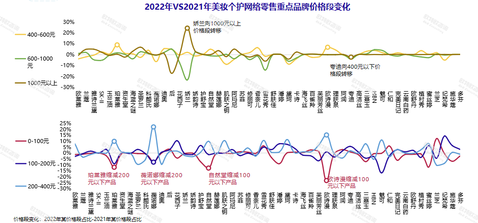 首先是價(jià)格向中高端轉(zhuǎn)移。目前來看,TOP品牌產(chǎn)品價(jià)格多在400元以上。而珀萊雅、薇諾娜等頭部國(guó)產(chǎn)品牌也在縮減其200元及100元以下產(chǎn)品。“這些品牌都在向中部?jī)r(jià)格段轉(zhuǎn)移,更為看重200-400元的增長(zhǎng)?!绷_興表示。