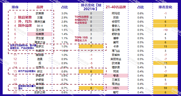 白皮書顯示,2022年美妝個(gè)護(hù)頭部企業(yè)格局基本穩(wěn)定,TOP5格局未變,仍為歐萊雅、寶潔、雅詩(shī)蘭黛、資生堂與LVMH。值得關(guān)注的是,本土企業(yè)珀萊雅、華熙生物崛起之勢(shì)極為明顯。