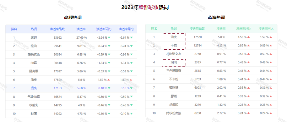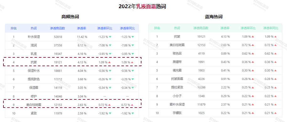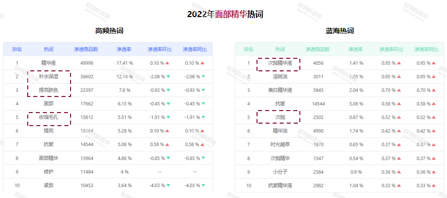 從消費(fèi)者端來看,補(bǔ)水保濕、提亮膚色仍為面部精華產(chǎn)品的重點(diǎn)需求,滲透商品數(shù)和滲透率也位于前排。與此同時(shí),次拋精華液、次拋等藍(lán)海詞匯滲透率也在逐漸上升?!熬A油這種新產(chǎn)品形態(tài)增長(zhǎng)較好,可能會(huì)是未來的一個(gè)增長(zhǎng)契機(jī)?!绷_興認(rèn)為。