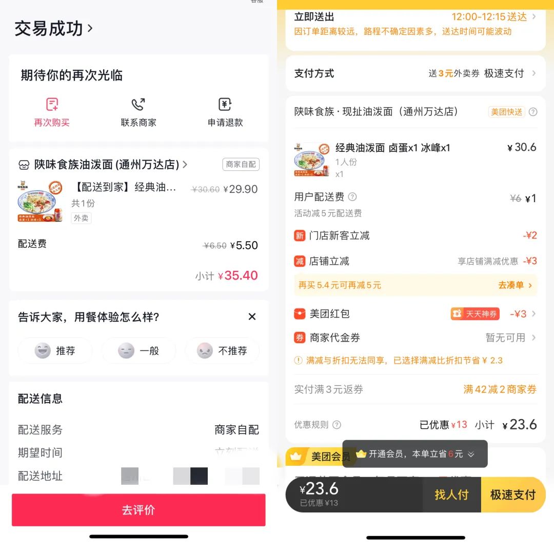以「自象限」在抖音上下單為例,同一商家的同一套餐價(jià)格相同,配送費(fèi)也均為5元左右,但美團(tuán)有各類補(bǔ)貼:配送費(fèi)減5元、新客紅包立減2元、天天神券立減3元,雜七雜八算下來(lái),比抖音便宜12元左右。