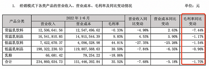 以去年5月上市的江西老字號陽光乳業(yè)為例,其上市短短幾個月內(nèi)股價就腰斬至不足最高點(diǎn)的一半,首份半年報也慘遭滑鐵盧,不僅營收和凈利潤雙雙下滑,且所有品類的毛利率均出現(xiàn)不同程度下滑。