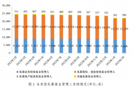 據(jù)中國證券投資基金業(yè)協(xié)會,截至2023年2月末,協(xié)會登記的存續(xù)私募基金管理人22174家,與2022年同期相比,呈下降趨勢;而管理基金規(guī)模20.29萬億元,較上月增加510.11億元。其中,私募證券投資基金管理人8606家,私募股權(quán)及創(chuàng)投基金管理人13259家。