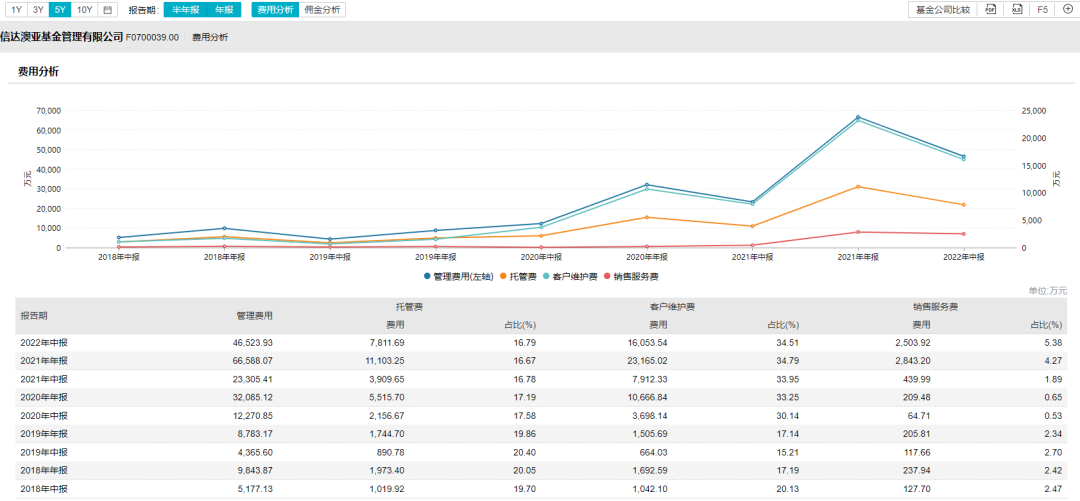基金公司管理費與規(guī)模直接掛鉤。據(jù)Wind數(shù)據(jù)顯示,2019年信達澳亞基金管理費為8783萬元,2021年時管理費達到6.66億元。2022年上半年,信達澳亞基金共收管理費為4.65億元。