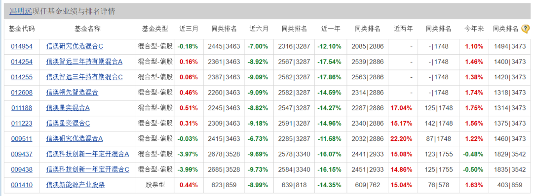 目前,馮明遠在管產品有信澳新能源產業(yè)股票、信澳科技創(chuàng)新一年定開混合、信澳研究優(yōu)選混合等6只產品。不過,其所管產品業(yè)績表現(xiàn)不佳,近一年均跌超10%,排名亦處于末尾部分。