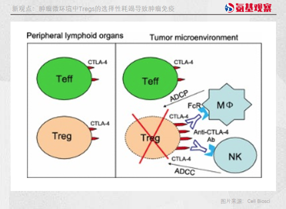 另一種學(xué)說(shuō)是“Treg派”。該學(xué)說(shuō)認(rèn)為,CTLA-4抑制劑是通過(guò)抗體Fc受體介導(dǎo)的ADCC及ADCP效應(yīng),清除高表達(dá)CTLA-4的腫瘤局部Treg,解除Treg的免疫抑制效應(yīng),以達(dá)到對(duì)抗腫瘤的效果。