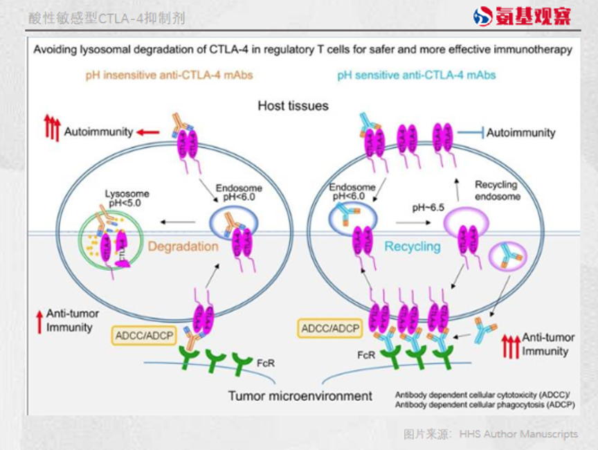 當(dāng)PH值小于6,也就是處于腫瘤的酸性微環(huán)境中時(shí),ONC-392則會(huì)迅速與CTLA-4分子分離,使CTLA-4避免被抗體誘導(dǎo)的溶酶體降解。通過(guò)這種方式,CTLA-4便不會(huì)被溶酶體降解,從而降低了CTLA-4抑制劑的毒性。