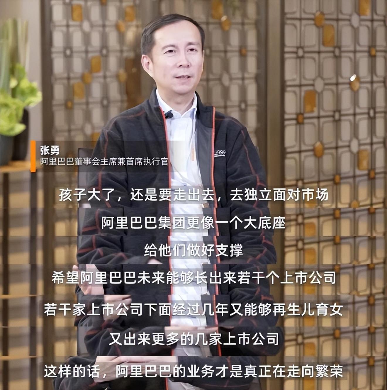 對于業(yè)務(wù)集團、業(yè)務(wù)公司上市,張勇則回應(yīng)道,“孩子大了還是要走出去,要獨立面對市場”“成熟一個,上市一個”“我們希望能夠出來若干個上市公司,而若干家上市公司下面經(jīng)過幾年又能夠再生兒育女,分出來更多上市公司”。