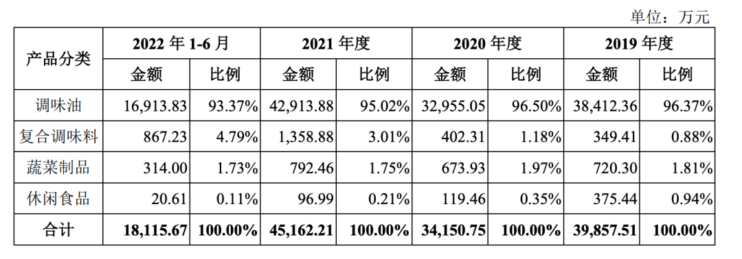 數(shù)據(jù)顯示,2019-2021年及2022年上半年,幺麻子的調(diào)味油收入分別為3.84億元、3.3億元、4.29億元和1.69億元,占比分別為96.37%、96.50%、95.02%和93.37%。報(bào)告期內(nèi),該公司來自主要產(chǎn)品藤椒油的收入占主營業(yè)務(wù)收入的比例在80%以上。