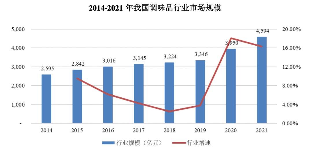 根據(jù)艾媒咨詢數(shù)據(jù)顯示,2014-2021年,我國調(diào)味品行業(yè)市場規(guī)模從2595億元增長至4594億元,年均復(fù)合增長率為8.5%。受疫情居家影響,2020年、2021年,我國調(diào)味品行業(yè)市場規(guī)模同比增長18.05%、16.3%。