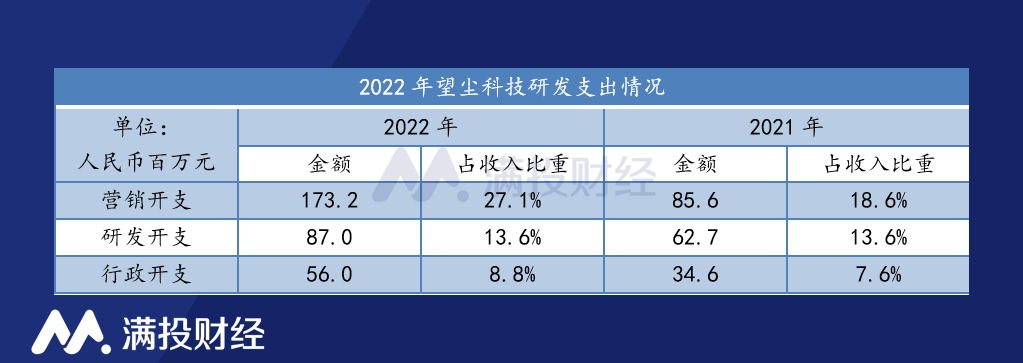 從費用端來看,2022年全年,望塵科技整體的費用支出達到3.16億元,占收入比重從去年的39.80%提升至今年的49.60%,整體占比規(guī)模提升明顯。營銷開支、研發(fā)開支、行政開支的金額分別為1.73億元、5600萬元、8700萬元,占收入比重較去年均有所提升。