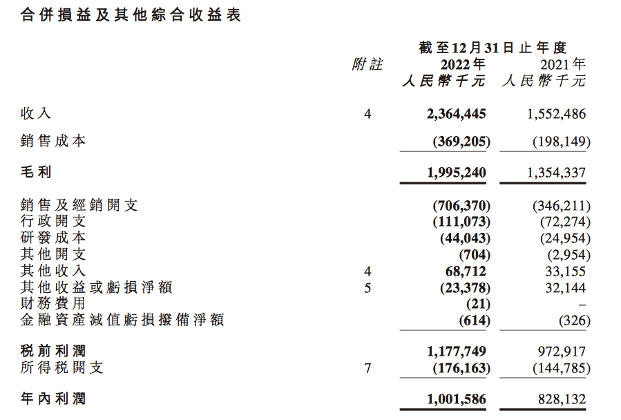 3月27日,巨子生物披露了登陸資本市場后的第一份年報,2022年營收23.64億元,同比增長52.3%;歸屬凈利潤10.02億元,同比增長21%。