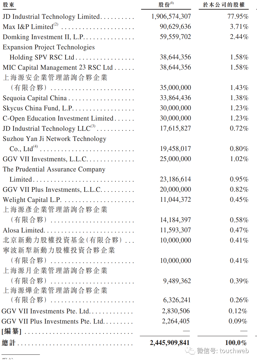 GGV持股為4.71%,Domking Investment II, L.P.持股為2.44%,Expansion Project Technologies Holding SPV RSC Ltd持股為1.58%,MIC Capital Management 23 RSC Ltd 持股為1.58%;