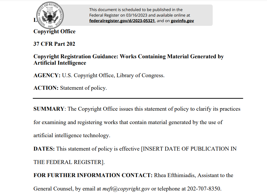 美國(guó)版權(quán)局?最近發(fā)布了關(guān)于用人工智能工具創(chuàng)作的作品的版權(quán)申請(qǐng)的新準(zhǔn)則。新規(guī)則承認(rèn),由人工智能輸入和人類(lèi)創(chuàng)作的作品都有資格獲得版權(quán)保護(hù),但其中任何完全由人工智能制作的部分都沒(méi)有資格。也就是說(shuō),版權(quán)保護(hù)只能延伸到可歸于人類(lèi)創(chuàng)作的作品上。