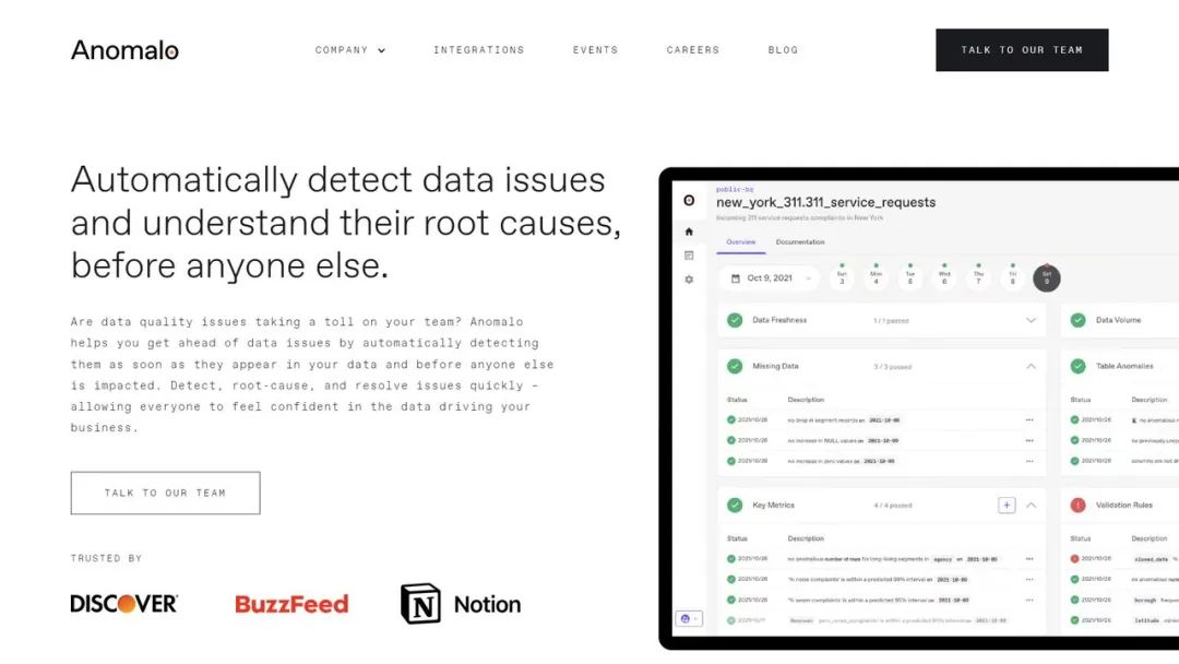 對標(biāo)國外垂直賽道中的典型案例Anomalo,它使用ML自動評估和通用化數(shù)據(jù)質(zhì)量檢測能力,實現(xiàn)了數(shù)據(jù)深度的可觀察性,以及數(shù)據(jù)質(zhì)量檢測的能力泛化。