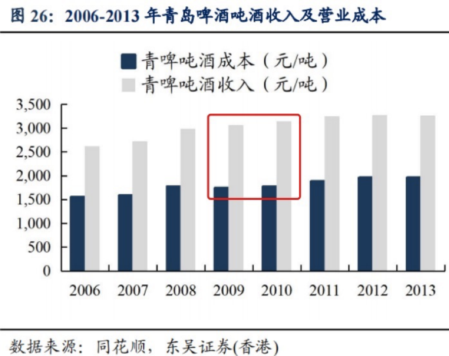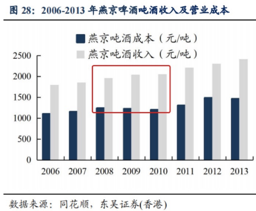 以青島啤酒為例,在2008年之后的兩年內(nèi),每噸啤酒成本穩(wěn)定后,收入也在提升。