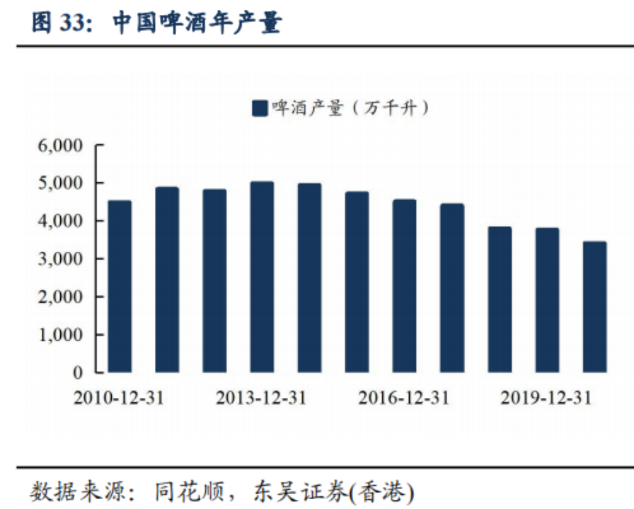 2013年之后,國內(nèi)啤酒產(chǎn)量逐年減少,各家由產(chǎn)量競爭,轉(zhuǎn)向質(zhì)量的較量。
