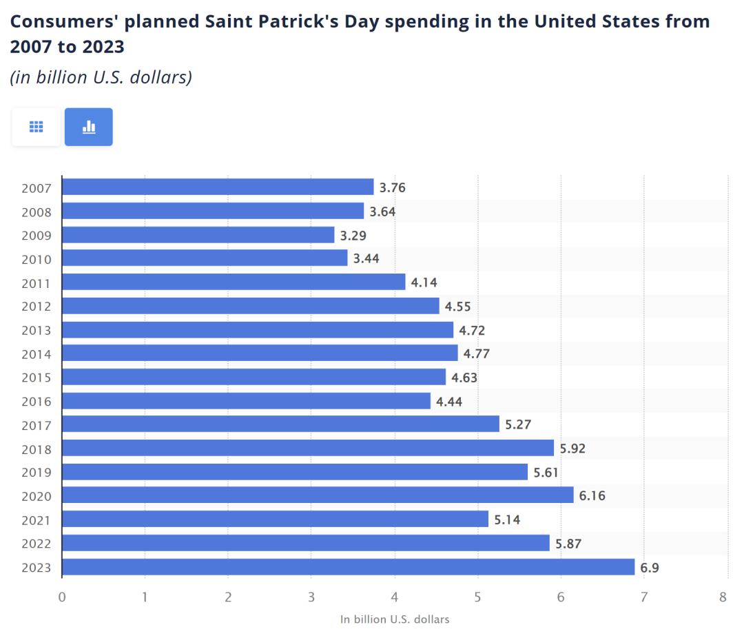 據(jù)德國數(shù)據(jù)同濟互聯(lián)網(wǎng)公司Statista結(jié)合市場調(diào)查數(shù)據(jù)估算,2023年,圣帕特里克節(jié)將為美國帶來約69億美元的經(jīng)濟收入。