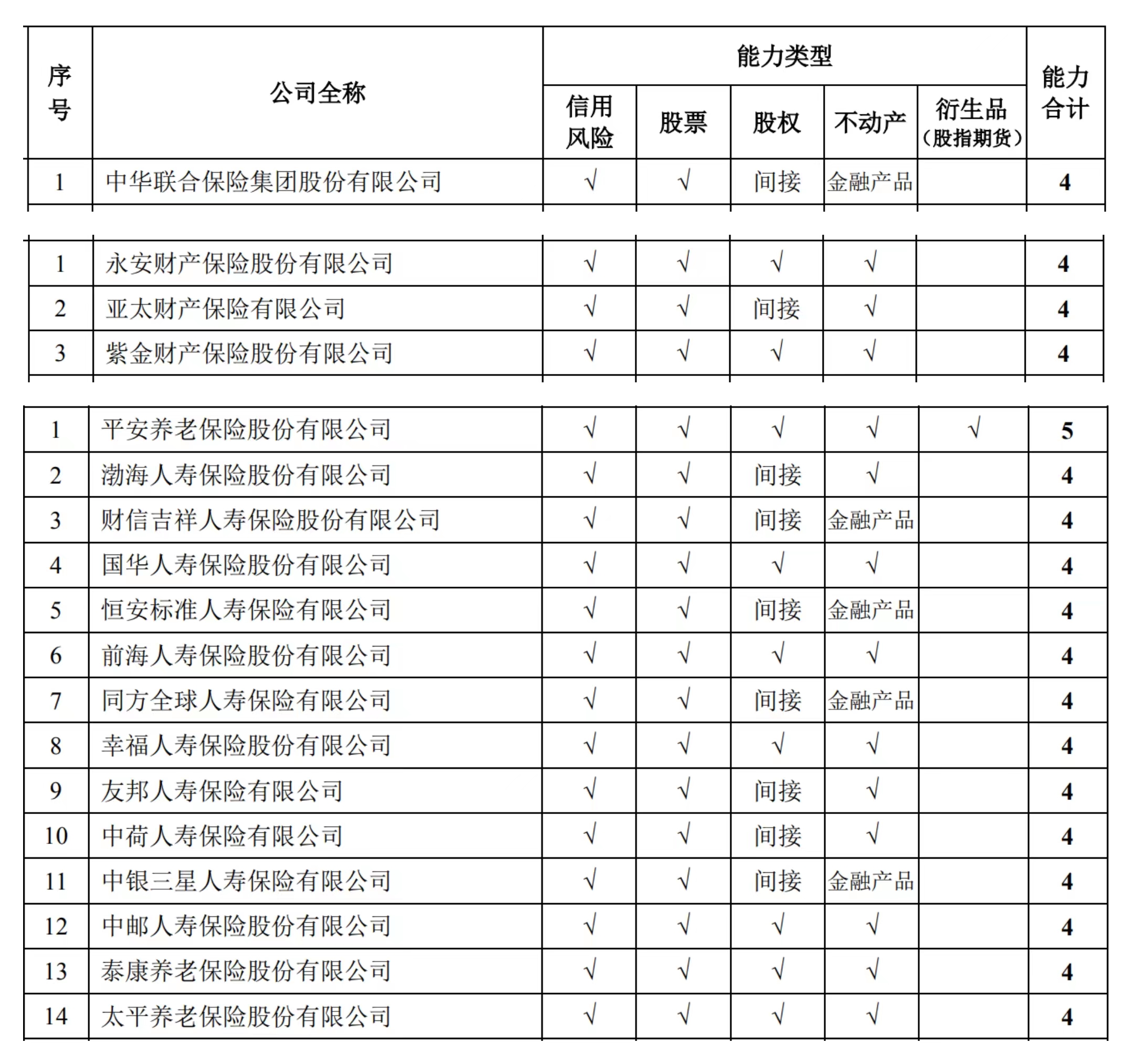 其余險資中,17家機(jī)構(gòu)具備四項投資管理能力,包括1家集團(tuán)(控股)公司(中華聯(lián)合保險)、3家財險(永安財險、亞太財險、紫金財險)和13家壽險(渤海人壽、財信吉祥人壽、國華人壽、前海人壽等);另有22家機(jī)構(gòu)同時具備三項投管能力,包括3家財險和18家人身險機(jī)構(gòu)。