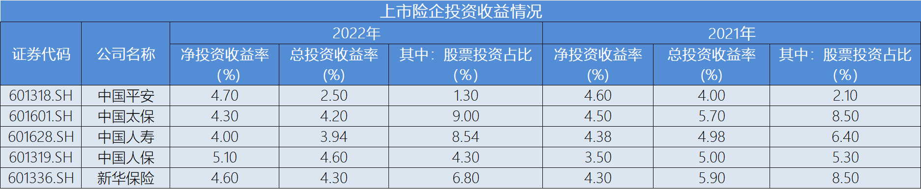 截至2022年末,五大上市險企投資資產(chǎn)運作規(guī)模悉數(shù)上漲,但投資收益率以及投資組合中的股票配比情況卻出現(xiàn)明顯分化。