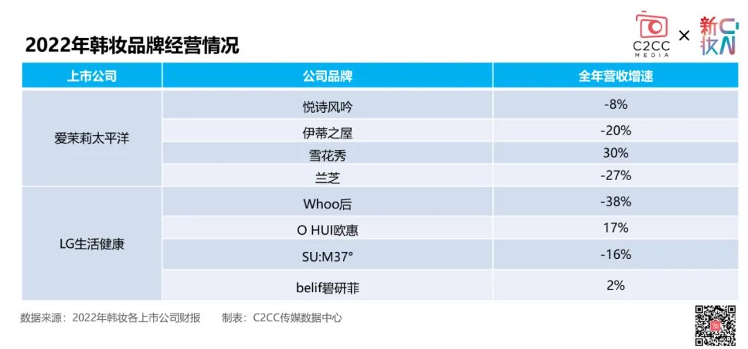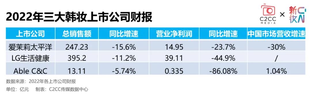 競爭對手LG生活健康的財報數(shù)據(jù)也不容樂觀,2022全年售額為71858億韓元(約合人民幣395.2億元),同比下降11.2%,營業(yè)利潤為7111億韓元(約合人民幣39.11億元),同比下降44.9%,十八年來首次出現(xiàn)業(yè)績下滑;