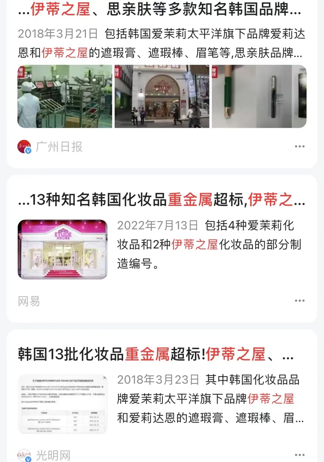 此次事件涉及愛茉莉太平洋集團旗下ETUDE HOUSE伊蒂之屋和ARITAUM兩個知名品牌在內(nèi)的包含遮瑕棒、眉筆等共9批次6款產(chǎn)品。