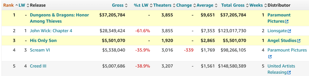 從拍攝預算來看,《龍與地下城》以1.5億美元的投資額領跑,超過《雷霆沙贊!眾神之怒》(1.25億美元)和《疾速追殺4》(1億美元),對派拉蒙收回成本也構(gòu)成顯著的壓力。進入次周,在《超級馬力歐兄弟大電影》的強大壓力下,《龍與地下城》重挫63%至1388萬美元,位次一路下滑到第4名,累計票房則為6166萬美元。