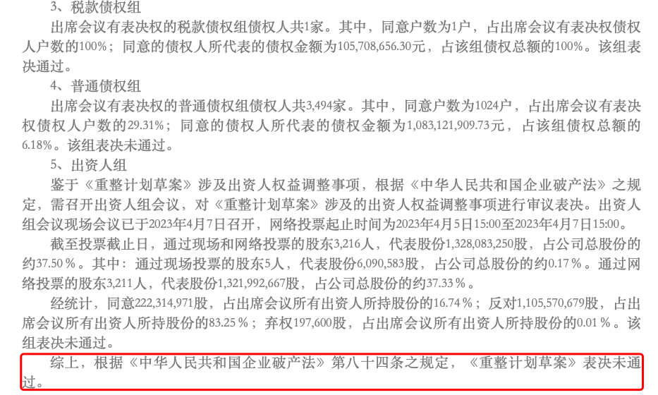 因此,在此次投票表決中,出資人組中進行投票的股東共有3216人,同意的僅占16.74%,83.25%均表示反對。普通債權(quán)組中,同意的債權(quán)人僅占該組債權(quán)總額的6.18%。