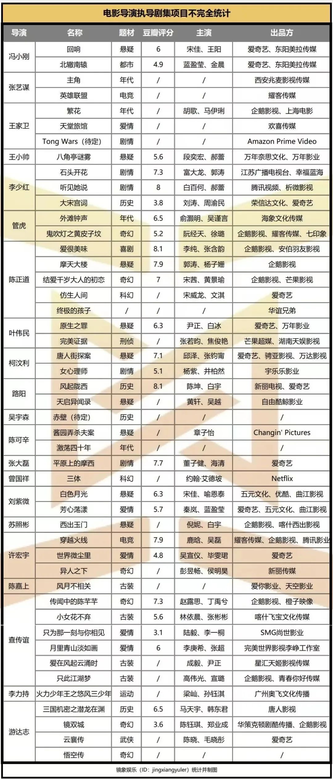 據(jù)鏡象娛樂不完全統(tǒng)計(jì),近幾年電影導(dǎo)演跨界作品達(dá)到40余部(包括未播作品),26部豆瓣已開分的劇集中,7分以上的僅有8部。僅就過去五六年的作品來說,在轉(zhuǎn)型拍劇的過程中,老牌導(dǎo)演表現(xiàn)出的不適感比新生代導(dǎo)演更強(qiáng),馮小剛、管虎、王小帥、李少紅等集體翻車。