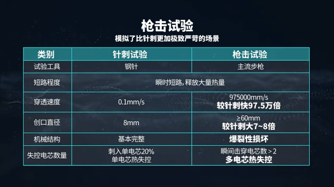 而此次的彈匣電池2.0又在初代的基礎(chǔ)上,將安全標(biāo)準(zhǔn)進(jìn)一步提高為“槍擊”,直接從冷兵器時(shí)代跨越到了熱兵器時(shí)代。相較于針刺試驗(yàn),槍擊試驗(yàn)對(duì)質(zhì)量的考驗(yàn)更加嚴(yán)苛——當(dāng)子彈穿透電芯時(shí),它的速度可達(dá)針刺的975萬倍,創(chuàng)口直徑是針刺的7至8倍,可瞬間擊穿多個(gè)電芯并造成熱失控和爆裂性破壞,但彈匣電池2.0成功做到了“無起火,無爆炸”。