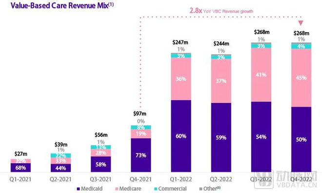 如果按支付方來分類,Babylon的價值醫(yī)療服務主要服務于Medicare、Medicaid、商保三個支付方。其中,Medicare和Medicaid服務范圍的擴大是其收入在2022年暴增的關鍵。2022年Q4,Medicare和Medicaid在其價值醫(yī)療服務收入中所占的比例已經(jīng)分別高達45%和50%。