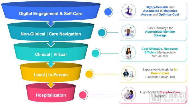 如前所述,Babylon的價值醫(yī)療服務是否能夠成功很大程度上取決于其是否可以有效地實現(xiàn)會員的健康管理,以及如何降低服務成本。正因為此,Babylon打造了數(shù)字技術優(yōu)先的“金字塔”體系。