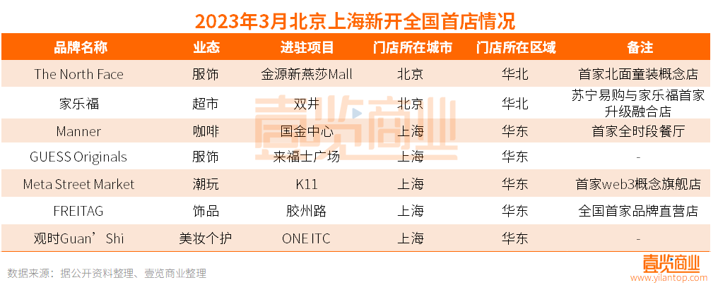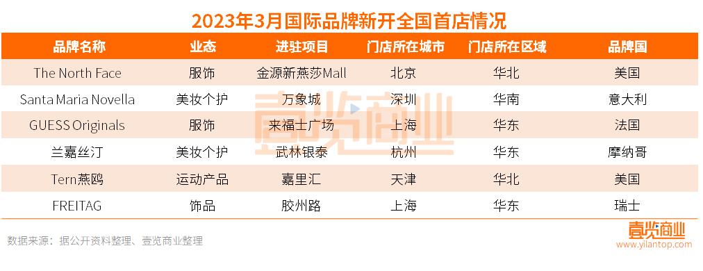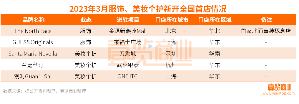 再看服飾行業(yè),從去年同期來(lái)看,服飾行業(yè)新增9家全國(guó)首店,占總店數(shù)的75%。而今年3月服飾行業(yè)僅新增2家全國(guó)首店,占總店數(shù)的15.4%,分別是戶(hù)外運(yùn)動(dòng)品牌The North Face和時(shí)尚潮流品牌GUESS Originals。