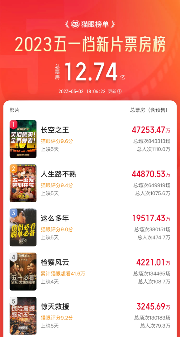 貓眼專業(yè)版顯示,4月29號,在《長空之王》《人生路不熟》《這么多年》正式上映第二天,三部影片的市場排位就火速發(fā)生變化,《人生路不熟》單日票房和累計票房超越《這么多年》,僅次于《長空之王》登上2023五一新片票房榜TOP2。