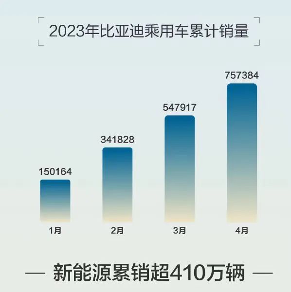 比亞迪4月汽車銷量為210295輛,同比增長約98.3%。今年前4月累計(jì)銷量已經(jīng)超過76萬輛,而旗下新能源車整體累計(jì)銷量超410萬輛。