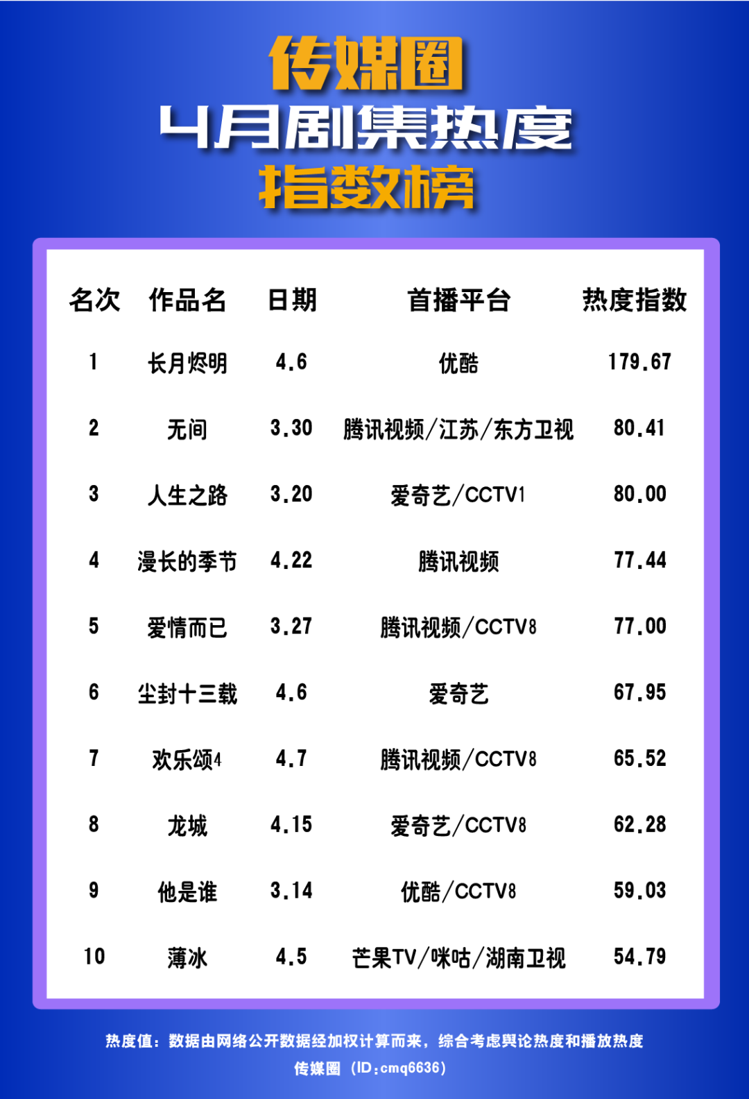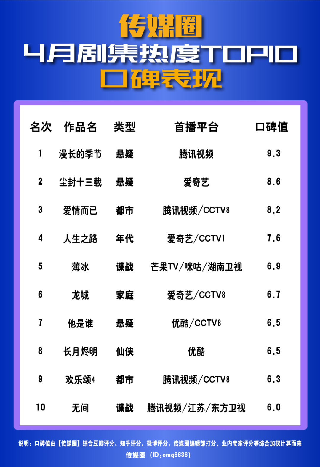 此外有《無間》、《人生之路》、《漫長的季節(jié)》、《愛情而已》、《塵封十三載》、《歡樂頌4》、《龍城》、《他是誰》、《薄冰》等劇各自憑借臺、網(wǎng)、輿情的不俗成績表現(xiàn)進入傳媒圈4月劇集熱度TOP10。