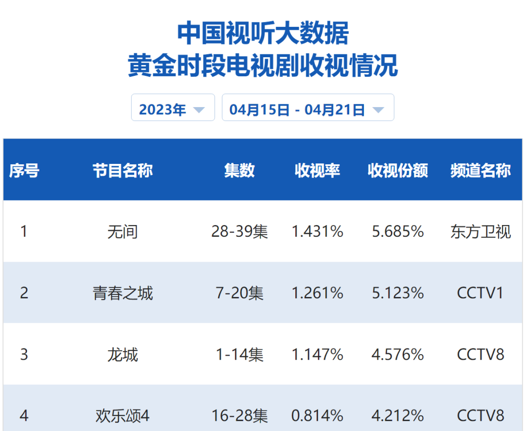據(jù)“中國視聽大數(shù)據(jù)”顯示,4月15日-21日《無間》東方衛(wèi)視的收視率高達1.431%,收視份額達到5.685%,為同期同時段電視劇第一。在《人生之路》和《他是誰》收官后,《無間》東方衛(wèi)視的收視率甚至超過了在央視播出的《青春之城》和《龍城》,同時該劇還在江蘇衛(wèi)視聯(lián)播,綜合起來收視份額顯然更加可觀。
