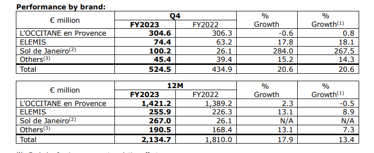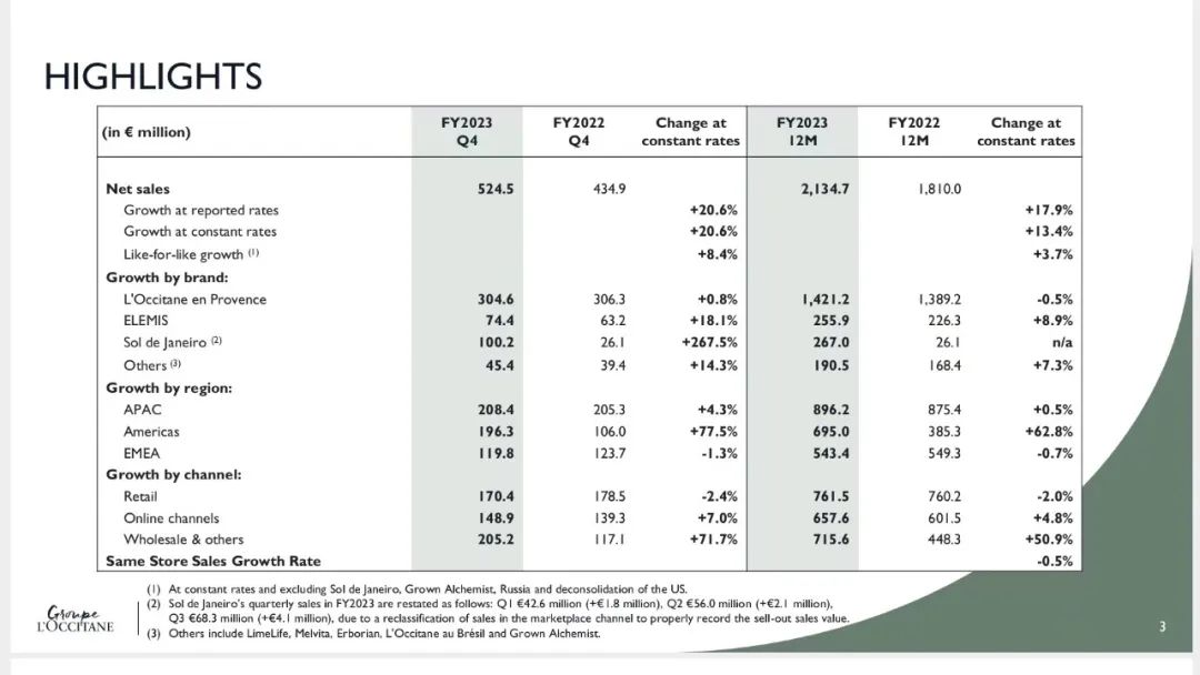 財報稱,歐舒丹第四季度的增長,得益于品牌歐舒丹充滿活力的旅游零售渠道,以及在中國解除疫情后銷售勢頭的改善。2023財年的增長主要由品牌Sol de Janeiro的出色表現(xiàn)和ELEMIS的穩(wěn)健增長推動。