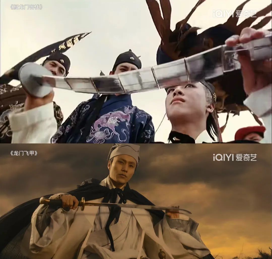兩部電影有一些相似的動(dòng)作設(shè)計(jì)——掰斷刀劍,彈作暗器。90年代甄子丹飾演的曹少欽雖然頂著大腮紅,但舉手投足間仍不失須眉之氣。林青霞凌空躍起從上方攻來(lái),甄子丹不慌不忙折斷一柄刀,飛做雪花狀向?qū)Ψ竭€擊,尚算實(shí)寫。