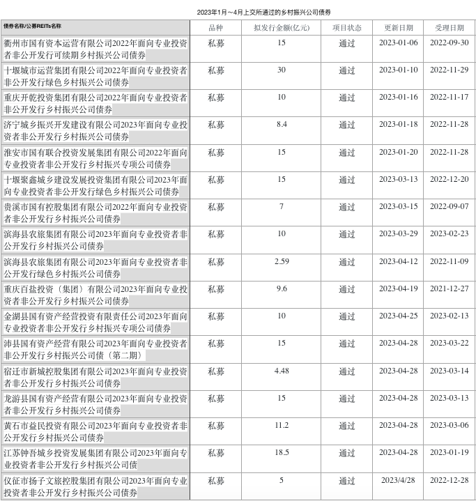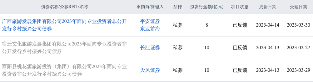 對比2023年前4個月,上交所審核通過的同類主體(濱海縣農(nóng)旅集團、儀征市揚子文旅控股集團)發(fā)行的鄉(xiāng)村振興公司債已達3只,擬發(fā)行金額合計17.59億元;此外,有3家地方文旅國企(廣西旅發(fā)集團、宿遷文旅集團和西陽桃花源旅投集團)發(fā)行的3只鄉(xiāng)村振興公司債券,項目狀態(tài)均于4月更新為“已反饋”,擬發(fā)行金額合計為28億元。