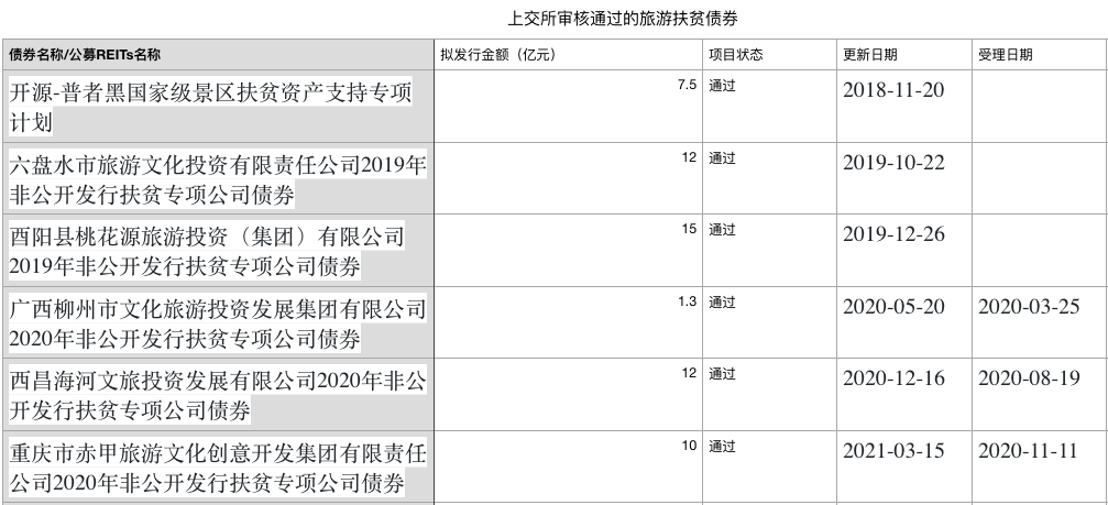 聚焦旅游扶貧債/旅游扶貧資產(chǎn)支持證券,該類創(chuàng)新產(chǎn)品從面世到完成使命(國家級貧困縣全部摘帽),上交所審核通過的相關債券共6只,擬發(fā)行金額合計57.8億元,涉及云南普者黑文旅開發(fā)公司、六盤水市旅文投資公司、西陽縣桃花源旅投集團、柳州文旅投集團、西昌海河文旅投資公司和重慶市赤甲旅文創(chuàng)意開發(fā)集團。