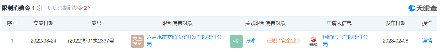 另需留意的是,為21六旅01和21六旅02兩只債券提供無條件不可撤銷連帶責任保證擔保的六盤水市交通投資開發(fā)有限責任公司,此前曾有多條歷史限制高消費記錄,而因拒不履行案號為(2022)鄂01執(zhí)2337號的判決(未履行金額為9000萬元),公司于2023年2月8日再遭限消。