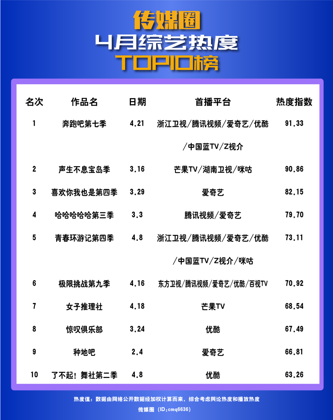 總體來看,4月綜藝熱度指數(shù)TOP10榜單中各方勢力頗為均衡,無論是從臺(tái)網(wǎng)綜藝角度,亦或是制播平臺(tái)角度,都呈現(xiàn)勢均力敵的狀態(tài)。