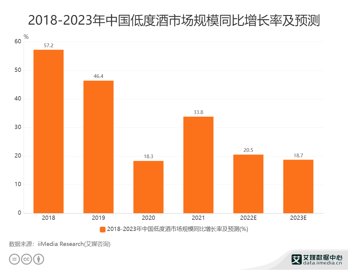艾媒咨詢數(shù)據(jù)顯示,低度酒市場(chǎng)規(guī)模在2018、2019年迅速擴(kuò)大,經(jīng)歷過(guò)疫情爆發(fā)后在2020年同比增速突然下跌至18.3%,在2021年有強(qiáng)勢(shì)反彈后達(dá)到33.8%,預(yù)計(jì)在2022年市場(chǎng)規(guī)模增速下滑、同比增速達(dá)到20.5%。