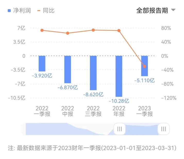 2023年第一季度,Robinhood的營業(yè)收入為4.41億美元,同比增長47%,環(huán)比增長16%;凈利潤為-5.11億美元,而去年同期為-3.92億美元,已連續(xù)第七個季度虧損。